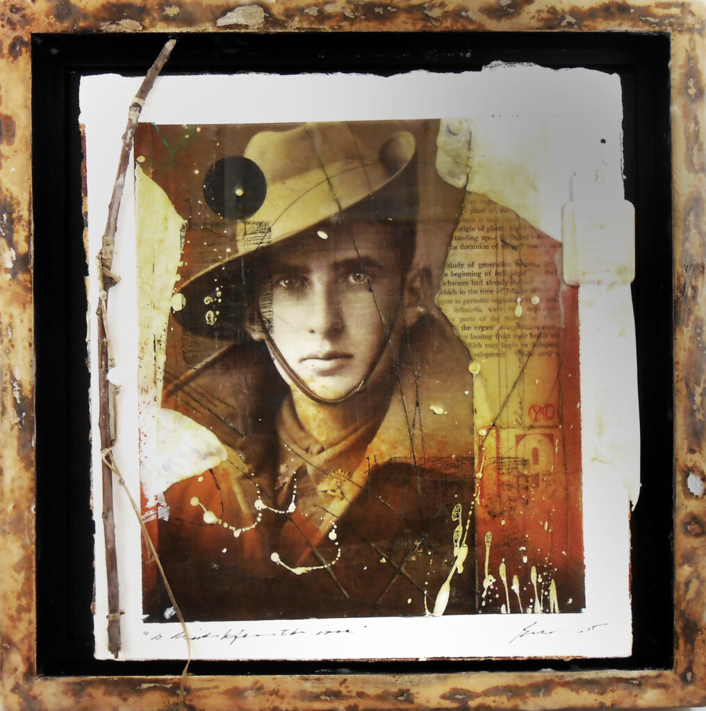 If a face is particularly striking, I save it to a special folder to use in my work – this one, for example, is an encaustic collage I did in 2015 featuring the mesmerizing image of an Australian World War One soldier, probably taken in 1917: