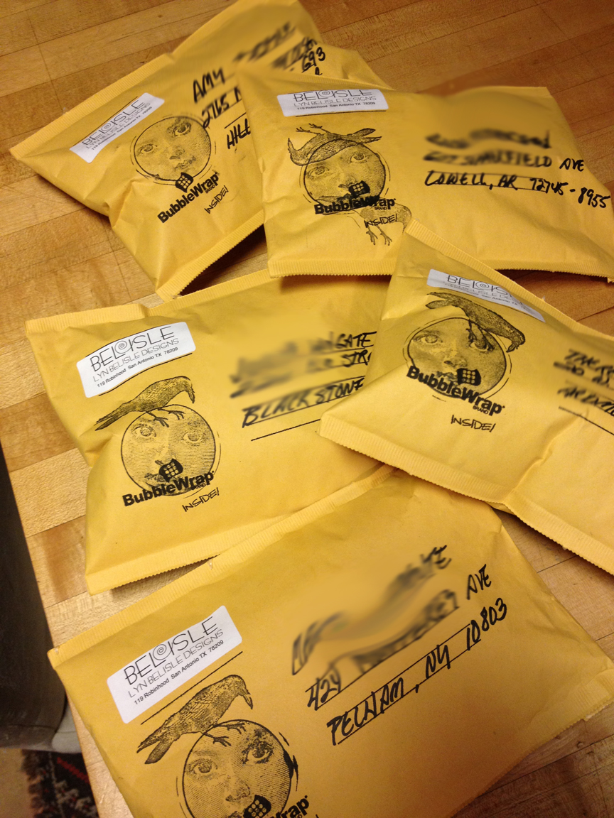 After Joanna posted her spirit doll instructions, I was swamped with orders for face shards – it was great! These five packages went out just yesterday afternoon. And the loveliest part is that I receive photos from artisans all over the country showing how they use the faces in their constructions – here’s one from Karen – it’s fanciful and celebratory.