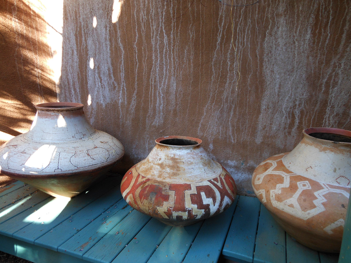 Staying here is like living in a Santa Fe dream – imagine a cluster of beautiful old adobe buildings around a courtyard with flowers blooming, fountains bubbling and pinon in the air. I could probably take a picture of something memorable every few feet while walking around the grounds. And the rooms are furnished and finished with tapestries and Oriental rugs. My suite is called Birdsong, and the second photo is the living room. Dang. It’s amazing. Here are a few of the morning’s photos.