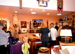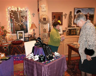 The studio was open for visitors, but the action was in the living room where my friend Jan and I set up our work – it was a cold gray day, but brave friends came out to eat and visit and shop. It’s such a good, low-pressure way to share and sell art. Jan and I both did well. Her work is gorgeous, especially her metal clay creations. Surprises for me were the pins and the little cards, which sold out quickly – lots of scent shards sold as well, so the event was successful on all levels. Here are a few photos – my house *almost* looks like a real gallery! Jan and I are planning another sale in April – hooray! I may be recovered by then.