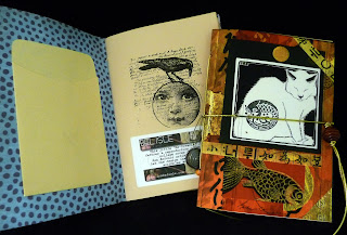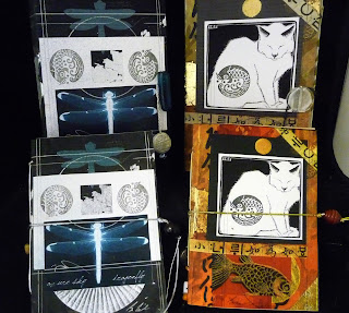 Funny name, but these little journals are the result of several friends’ advice urging me to reproduce my original journal and kindle designs. These “Re-Coverie” journals (appropriate name in many ways) are traditional chapbook construction which feature a color scan of the original designs. The smaller version, little journals that are 5×7″, are sewn with elastic metallic cord so that the “tail” of the book can be pulled over as a closure. My friend Gina gave me good advice on trimming the pages. I’m happy with the results, plus it’s a good way for me to keep track of my original designs from now on.