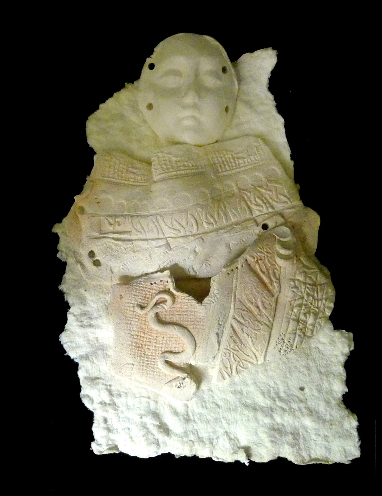 Straight out of this morning’s kiln firing, here are some sculptural pieces built as part of a small paper-and-earthenware assemblage. The first photograph is before the firing during the “thinking” stage. These have no surface treatment at all but I think the combination of paper and clay (much like I did for the Art League show) has a lot of promise. I hope my beloved studio partner has lots more cast and pressed paper for me to steal!