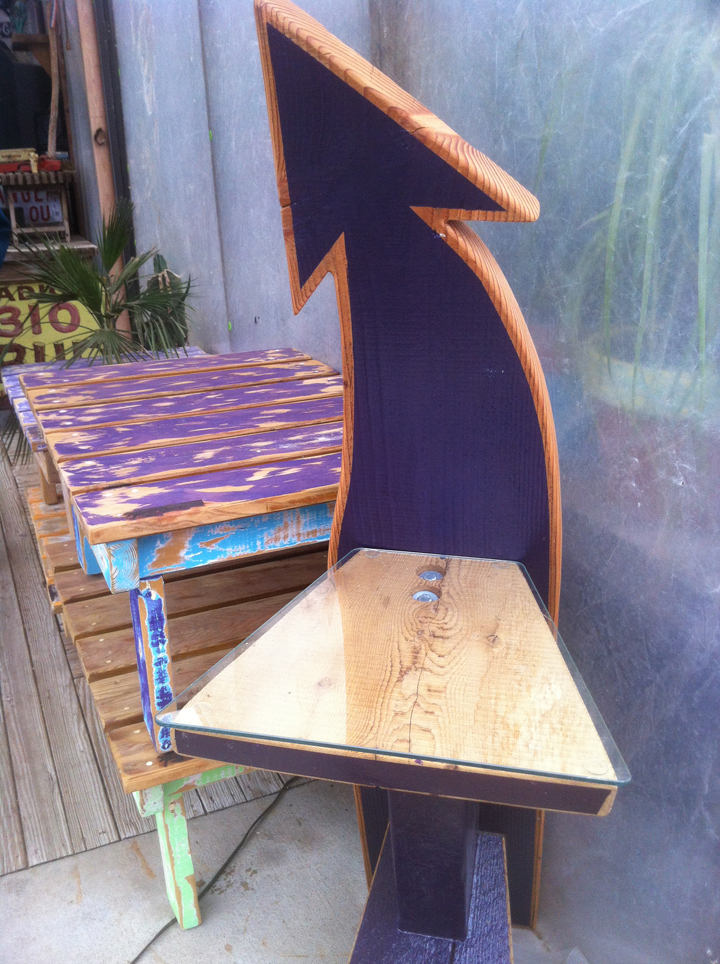 Last week a group of us met at an artist friend’s house to discuss an upcoming herb garden tour. Marty, the homeowner, is a multifaceted furniture designer (check out the arrow table/bench), painter, and cactus sculptor. His garden is a fascinating mini-botanical arboretum with cactus and succulents and raised beds and structures. If you look at the last photo, you can see that he cuts stars on some of his cactus plants and they continue to grow like that as they reproduce. Wow. Marty has a new gallery in Wimberley, Texas – I haven’t seen it yet but I imagine it’s as interesting as his house.