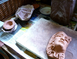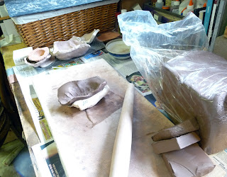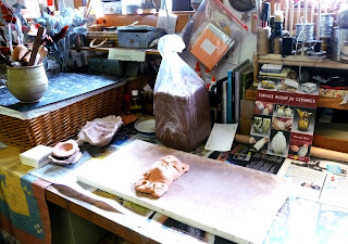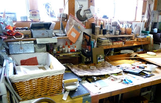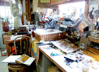 Behind in my work as usual, I had to do a quick change from a collage and drawing studio to a clay studio in about half an hour today. Actually, I’ve organized my tools so that it’s fairly easy. I keep all of my clay tools, clay press molds and carving tools, and rolling boards stacked in one area behind a kitchen butcher block shelf. And I have baskets for the collage material – here are some pictures which show the transformation. Pretty slick re-purposing in a small space!