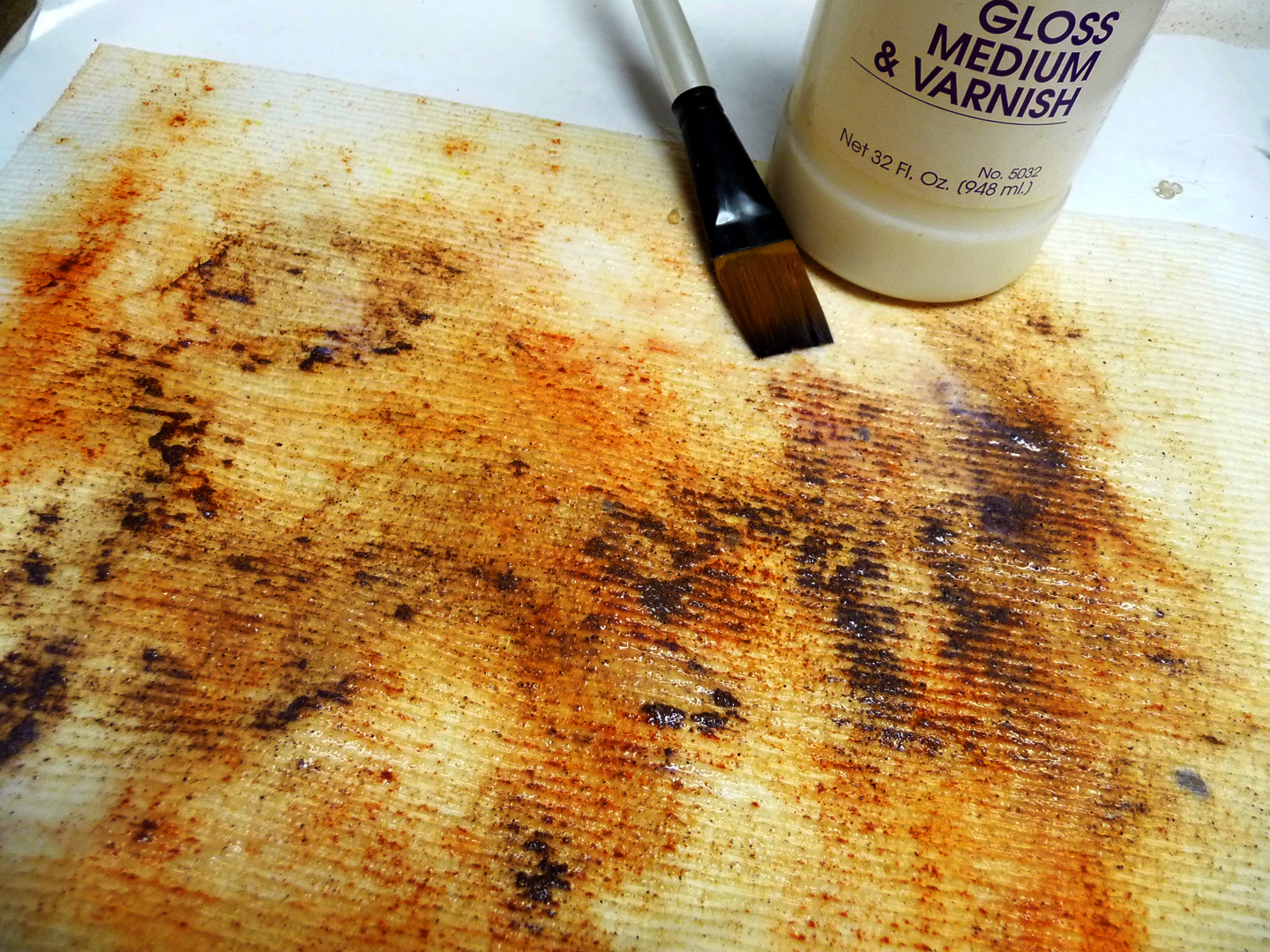 I was experimenting with paper towels when I saw some great stain patterns that were left after cleanup yesterday. A blog post on Cloth Paper Scissors prompted me to try some kitchen ingredients for mixed media surface enhancement, so I got some curry powder and some Chinese Five-Spice Powder and sprinkled them on very damp paper towels (white with fiber). It looked good – after it dried a bit, I brushed off the small clumps and painted some gloss acrylic medium over the surface.