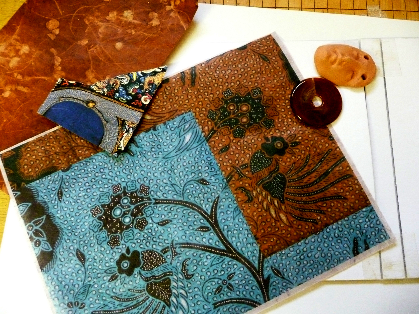 I needed some batik print accents for a journal cover I created recently, so I turned to my trusty scanner and laid my 35-year-old Indonesian batik sarong on the flatbed of my scanner.