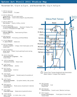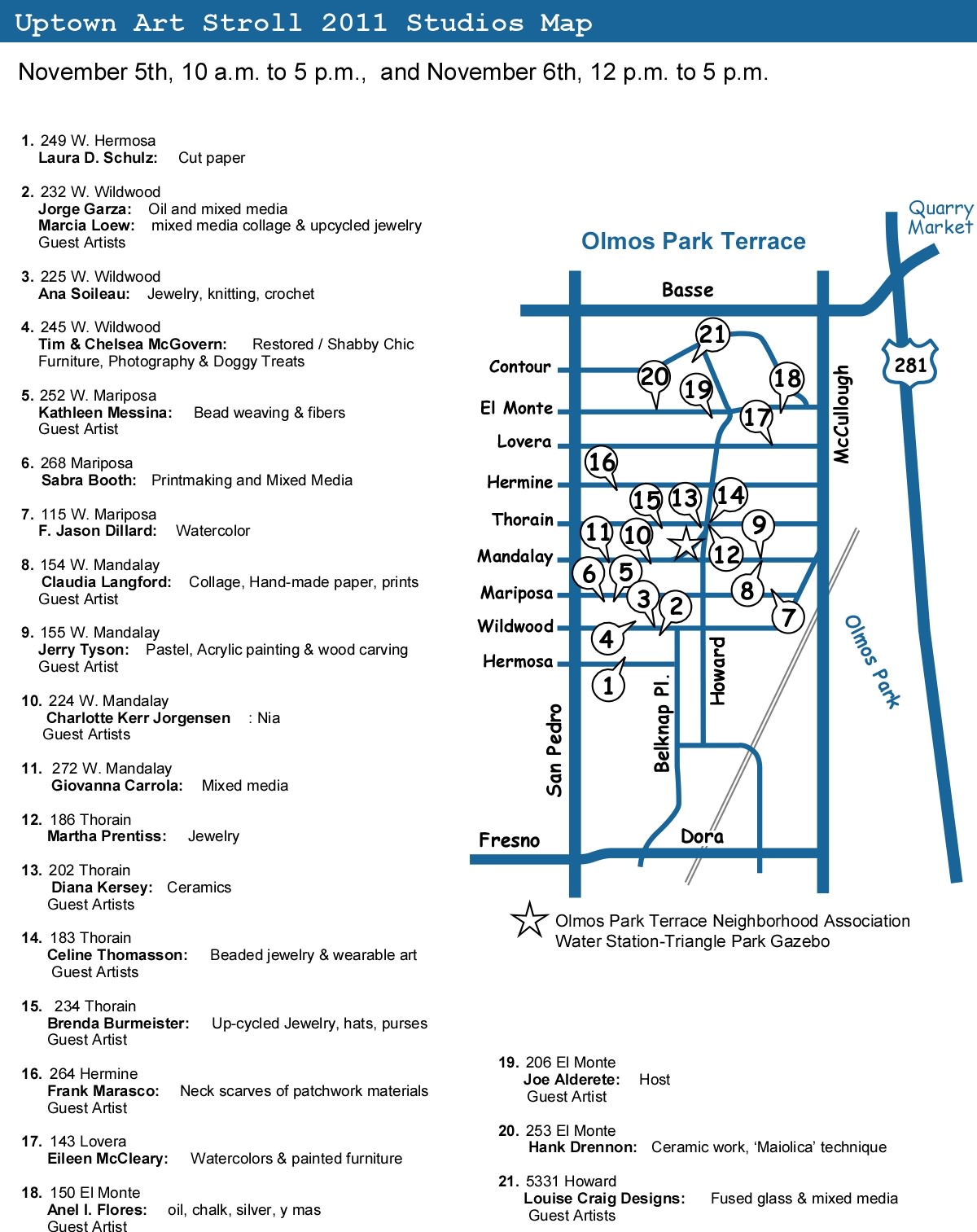 I haven’t done much of this, but will be participating in a large arts fair called Uptown Art Stroll in the Olmos Park Terrace neighborhood. My friend, knitter and weaver Kathleen Messina, has invited me to share her space. I’ll be taking Scent Shards and cover examples. Here’s a map that shows how extensive a “stroll” it will be. Fortunately for art lovers, there’s going to be a trolley, food booths and music to make strolling more fun.