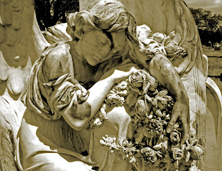 The first photo shows me reaching up to take a face mold from a tall angel statue – I use only white clay to leave the stone unblemished, and the process takes just a few gentle seconds. The other two photos show monuments that I thought were particularly lovely.
