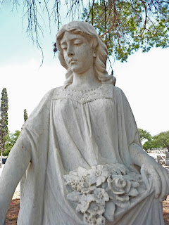 San Antonio is graced with beautiful old cemeteries – it’s one of the oldest cities in the Americas. I don’t have to look far for compelling faces to use as celebratory face molds for my Scent Shard sculptures. I took a trip to San Fernando Cemetery by the Missions today and came away with some beautiful press molds that are going to be ready to use after they are fired. I also took a lot of photos and could have take lots more. There were families picnicking on relatives’ graves and lots of really funny gaudy bright arrangements everywhere. Shops around San Fernando sell these. Some have cartoon characters like Bugs Bunny festooned with polyester flowers. But the sculptures and monuments are unrivaled.