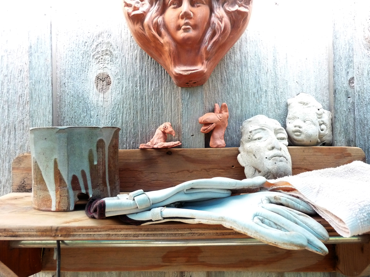 The Scent Shards page is growing and expanding on my own website – check out the videos. No matter what happens, this is the most fun I’ve had in a long time. See the little kiln’s new home in these photos. There’s a shelf above the kiln with the Kiln Gods that my grandsons made to ensure a good firing, and there’s a drying rack for unfired pieces – it’s a wonderful space.