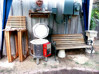 It works! The little Skutt kiln that I bough on Craig’s List, brand new, has been wired, test fired and welcomed home to its own little tented firing pavillion outside my garden gate. The wiring cost half as much as the kiln itself, but the total cost was still less than half of what it would have cost from a retail clay supplier.