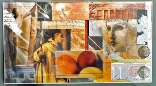 That was the title of an painting by 15th century artist Albrecth Durer – I liked the painting and just finished a collage that has both pears and a Madonna. It features two versions of the same photo that I took of a pear but with different lighting. It really looks sort of Dali-esque to me. This work is 20×24″ framed. It was a tough piece to complete and went through a lot of phases but I like the results. I used a lot of gold leaf on this one.
