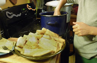 The day before New Year’s Eve, a group of friends gathered at Casa Belisle to make tamales. What was I thinking? But we did it! Ten intrepid tamale makers, including our expert, the fabulous Elaina, spread homemade masa (lard-y and veggie) on shucks, filled the tamales with beef, pork, beans, squash, chiles, cheese – all manner of wonderful things, rolled folded stacked and steamed. The result? At least 16 dozen of what were undoubtedly the best tamales we’ve ever eaten. It was a holiday miracle – good intentions, lots of laughter, and one person who knows what to do and can show the rest of us works. Special thanks to Elaina, who can pull steaming tamales our of the pot with her bare hands to check to see if they are done, to Raven and Sandra for washing mounds of dishes, to the wine and cheese bringers, to Jim for being a good sport at a grownup party, to Michael for making masa and fillings, to Sherry for the awesome shredded pork, to Stuart for the veggie inspirations, to Carol for the Lady of Guadalupe that blessed the venture – and a happy new year to all!