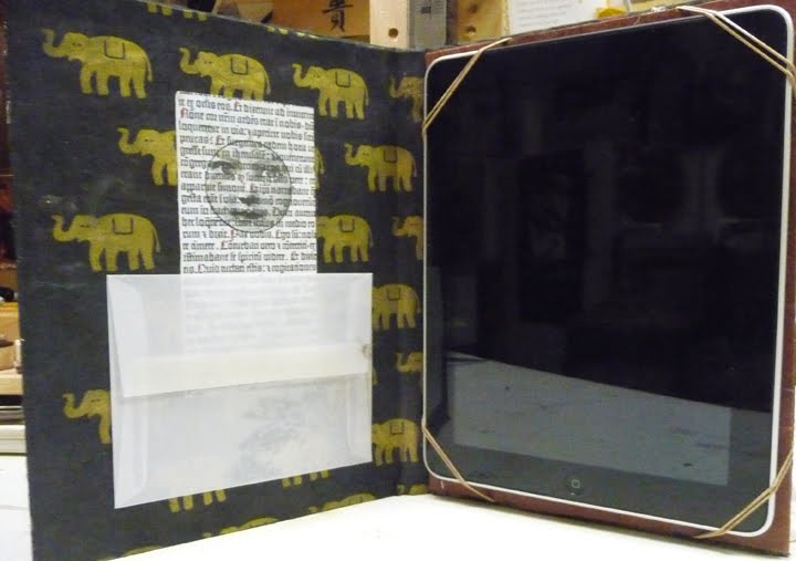 It came to me in a dream – actually, I did think of it just as I was waking up Sunday morning. I had worried about the iPad slipping out of the covers from the bottom. I was attaching the bands horizontally on both those covers and the Kindle covers. It worked fine on ereaders, but I “saw” that I should be putting them diagonally on the corners for iPads to keep them from slipping. It worked great. I retrofitted one of the covers that had sold but not shipped,and I think that the buyer will be a lot more pleased with the secure fit of his iPad! See the old version and the new, below: