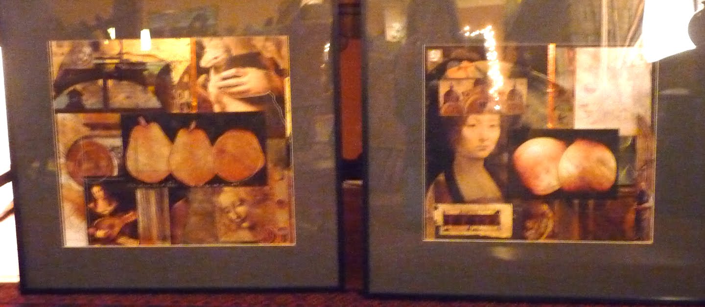 The two pieces are titled “Inedible Fruit” (right) and “The Architecture of Dreaming” (left) and both are 22×24″ framed.