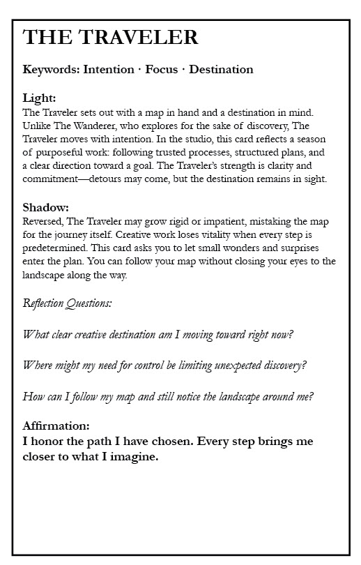 Definitely “The Traveler.” I envy the wild Wanderers! I like a road map, a plan, a final object envisioned. I like to research materials, be sure of their nature, form a design, and see that final destination. I don’t enjoy too many surprises or diversions from my path. Creatively, obviously I could benefit from being less of a planner. (New Year’s resolution 2026, embrace the wild wanderer within?) Thanks again for the thought provoking exercises and for sharing the Enso cards!