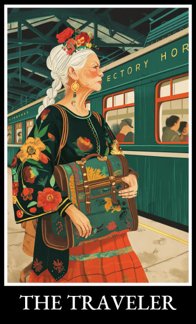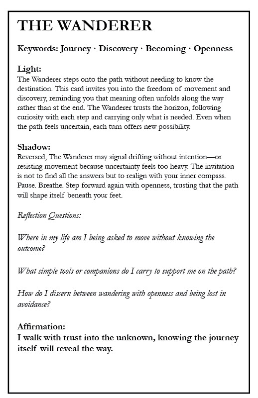 A section in the in-progress Enso Oracle book called Subtleties and Pairings: When Meanings Overlap says, “Some cards in The Enso Oracle may appear to speak the same language, yet their tones differ quietly, like two instruments playing in harmony. The Wanderer and The Traveler, for example, both move through the world, but their motives are distinct: The Traveler walks with purpose, guided by curiosity and direction, while The Wanderer drifts in openness, allowing intuition rather than intention to lead. One seeks, the other listens.”