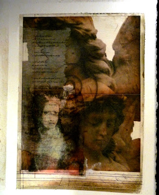 In preparation for my upcoming Image Transfer Workshop, I figured I’d better try out a few things – techniques have certainly changed since my undergraduate days when we used magazine pages and lighter fluid. It’s a wonder we didn’t set the Trinity art studio on fire. These two transfer compositions are done with rice paper and with soft acrylic gel. Both use inkjet images. I’m still working with various combinations and timings. It’s tricky, but even the less-than-perfect results are interesting.