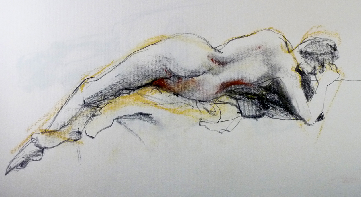 With more than a little fear and trepidation, I joined a Saturday morning group of artists who meet at Inspire, pool money for a model’s fee, and spend two hours in intensive life drawing. I had not done this in decades. It was an amazing experience – liberating and confirming. I can still draw! Obviously my work is rough and my proportions are sometimes badly rendered. but it was great to be “back to the drawing board.” Here’s one of my early studies of Morgan, our amazing model.