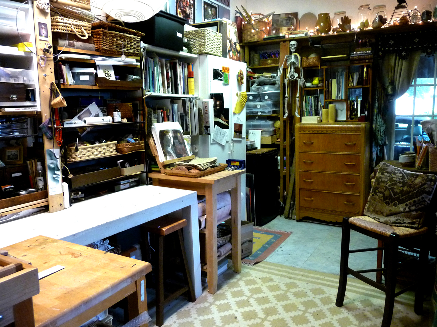 It’s a clean studio (in relative studio terms). It took a few hours, but I’m ready for tomorrow’s workshop. Among the things I found were my lost bee stamp, my lost favorite face mold, a bunch of assorted beads, chopsticks, and a plastic elephant. And tons of clay dust and paper scraps. Switching from collage to clay really is a challenge! But I’m ready for my Collage on Canvas class tomorrow – yay! Here’s the unvarnished photographic record of spotlessness . . . well, maybe not “spotlessness” – but improvement, nevertheless.