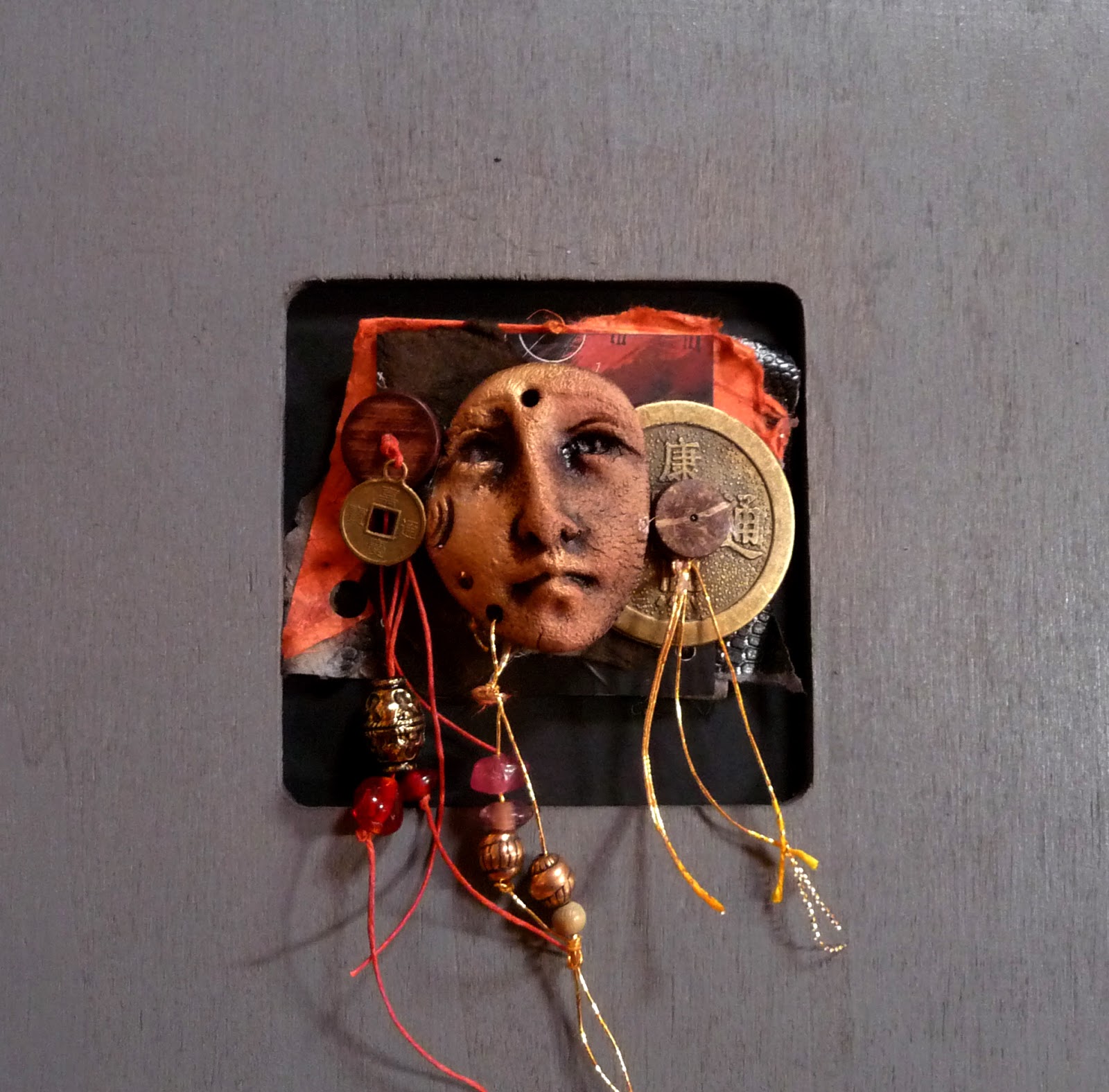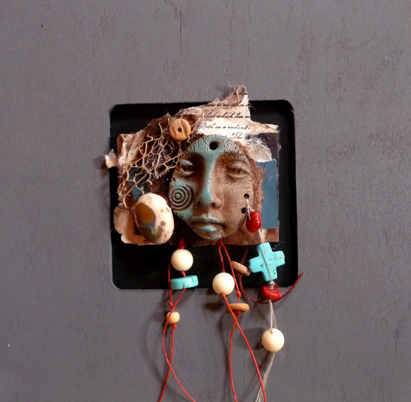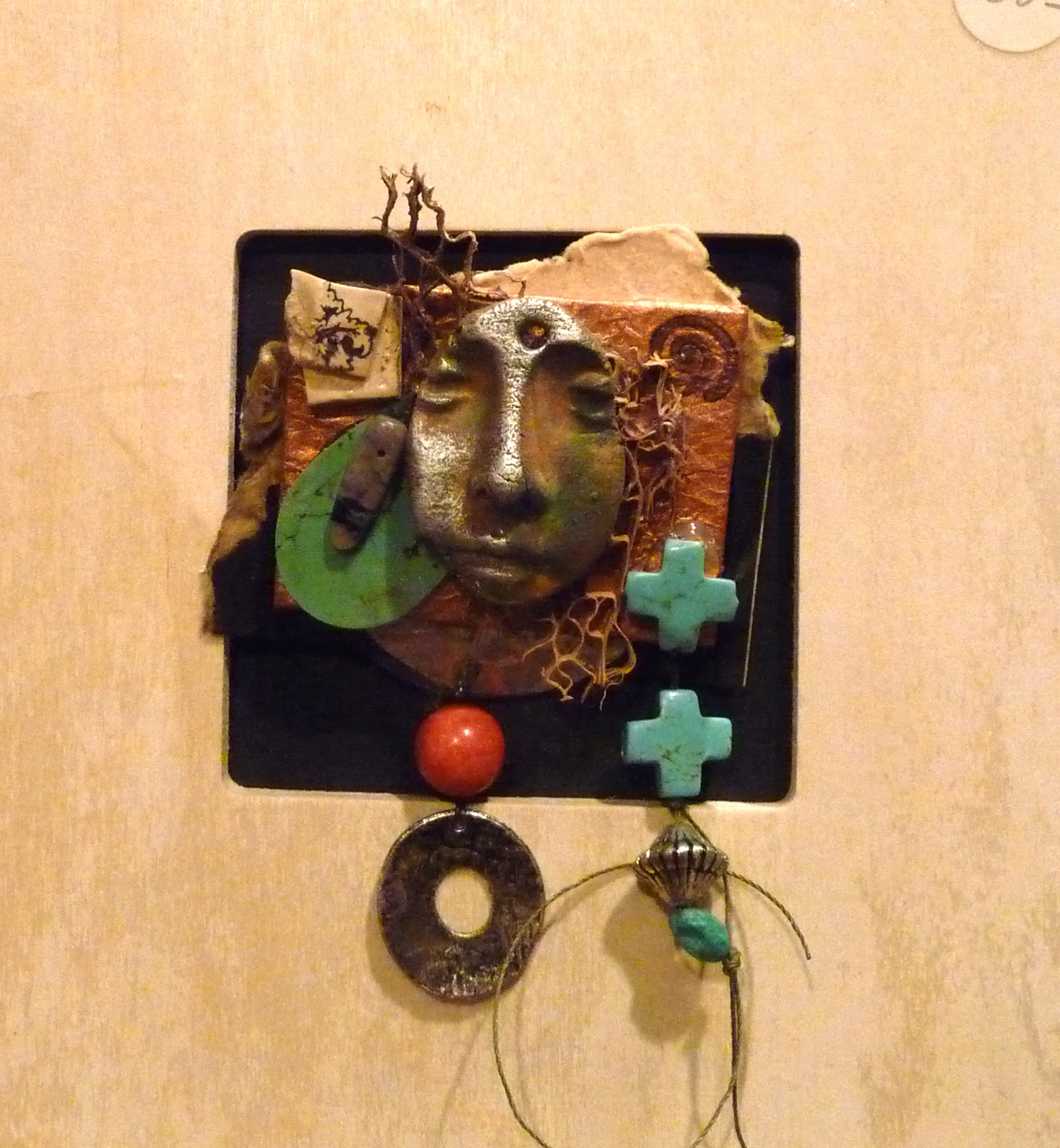 It’s been a while since I’ve done these little shard pin collages- I love working in this format. Here are ten new ones from the studio. They will go with me tomorrow to the Trinity Alumni Artisan Show. If you haven’t seen these before, they are clipped to the frame interior matboard with a strong bar magnet so they can be taken off and worn as a pin. There is also a clear straw “channel” on the back that a cord can go through so the construction can be worn as a pendant. They also look cool on a hat – or a lampshade 🙂 I’ll have more of these at my December 1st Open House/Open Studio event. Invitations will go out next week and everyone is invited!