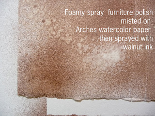 Here’s a place to post various collage and painting techniques that I happen to stumble on or think up – this one involves distressing Arches watercolor paper that I use for my Kindle cover interlinings. Spray on furniture polish, cover lightly with walnut ink, and blot. Nice aging effect – and it smells like a clean house 🙂