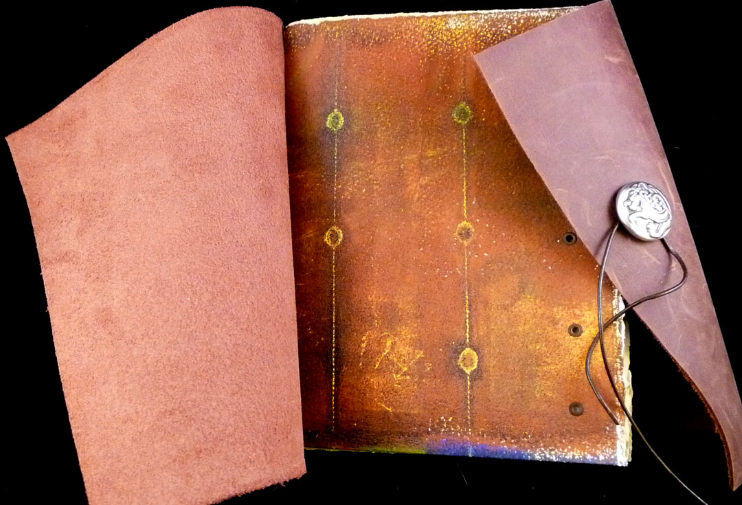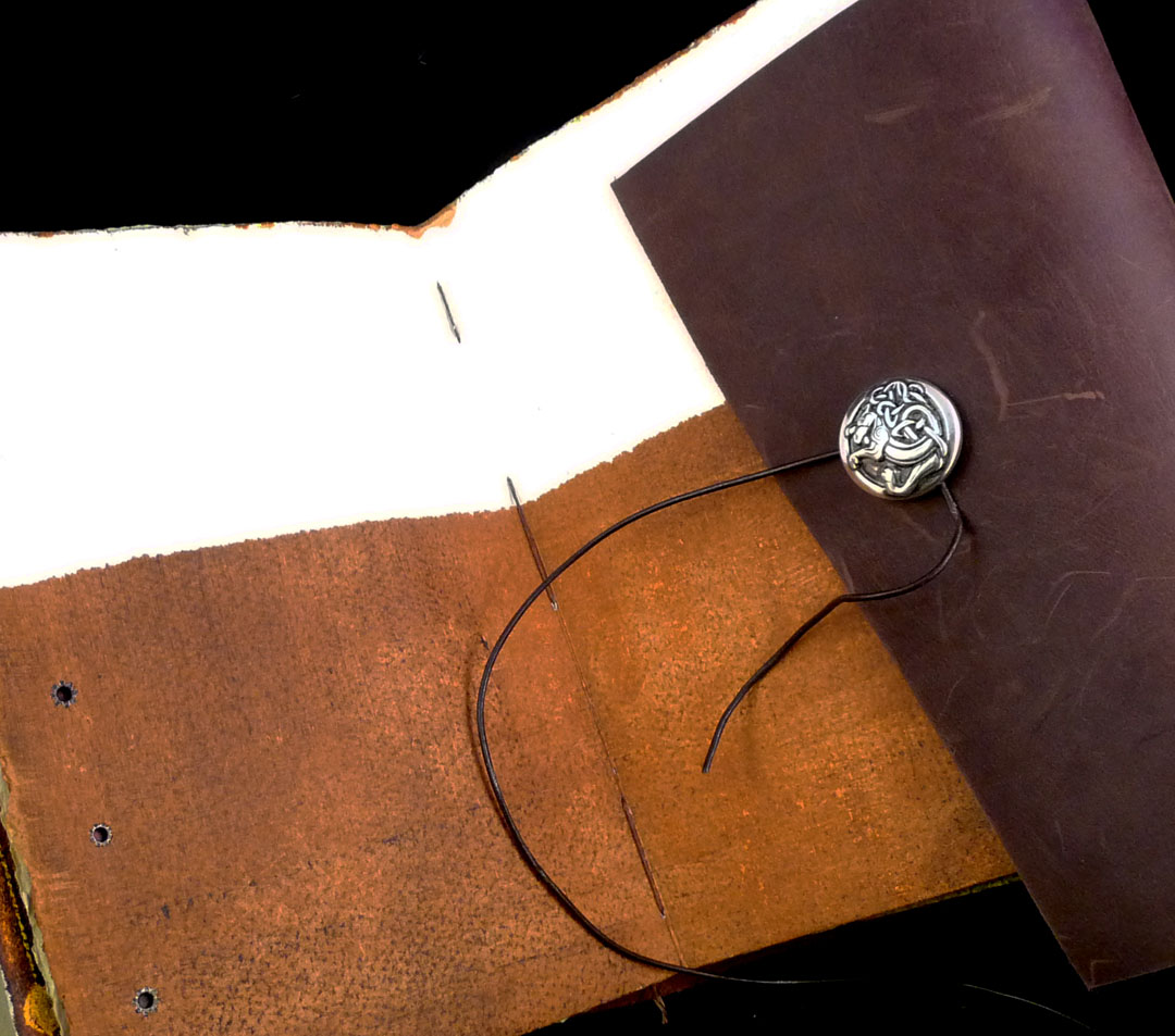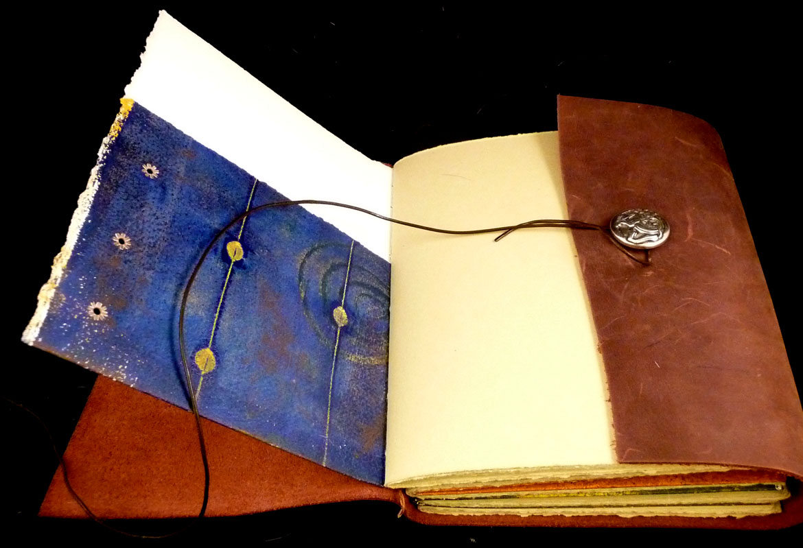 For his gift journal, she crafted a brown leather wrap cover that closes with a silver Celtic dragon ornament, and the inside paper is beautiful ivory. Gina includes touches like pockets and envelopes to hold notes and tickets, and her hand painted divider pages are amazing. It’s a perfect blend of form and function – the thought and craftsmanship she puts into her work is inspiring. Thanks, Gina, this is a treasure.