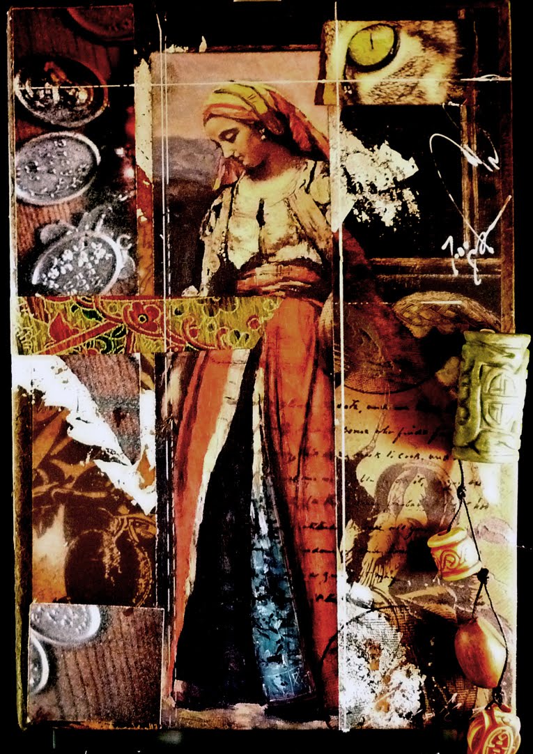 I was watching a collage video on You Tube and the demonstrator kept talking about Soft Get for adhering paper – what’s that?? I found some at Michael’s and tried it – great stuff! It works beautifully for delicate papers such as joss and tea papers. Here’s a pic of one of the latest covers with joss paper accents: