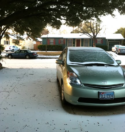 Another news flash – it snowed in San Antonio this morning. Trinity University is closed, so I get to spend the day in the studio – yay! Here’s a view out the studio doors – poor Prius.
