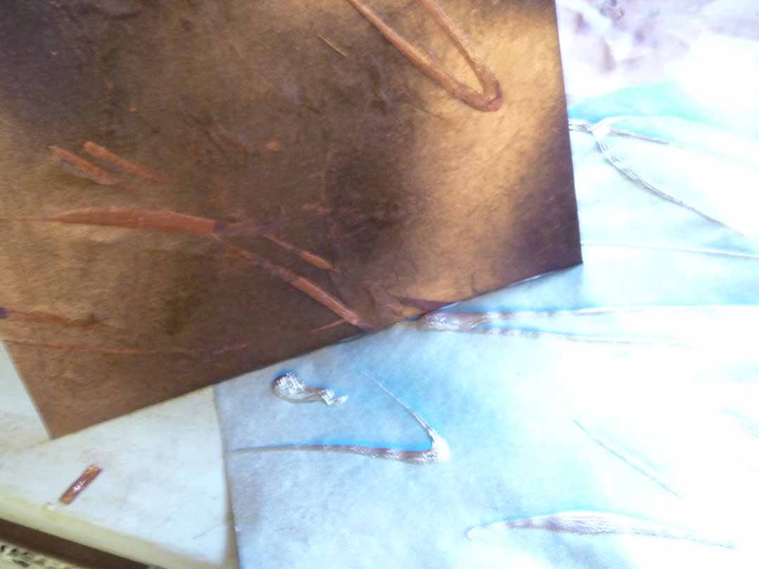 It came to me in a dream – actually, I did think of it just as I was waking up Sunday morning. I had worried about the iPad slipping out of the covers from the bottom. I was attaching the bands horizontally on both those covers and the Kindle covers. It worked fine on ereaders, but I “saw” that I should be putting them diagonally on the corners for iPads to keep them from slipping. It worked great. I retrofitted one of the covers that had sold but not shipped,and I think that the buyer will be a lot more pleased with the secure fit of his iPad! See the old version and the new, below:
