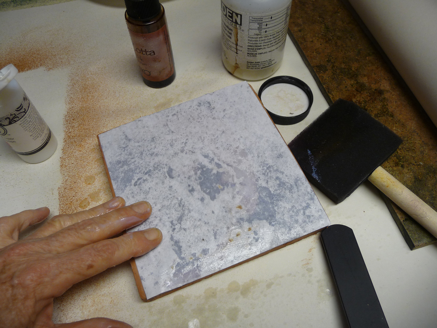 I loved this workshop group – we experimented a lot and got crazy results, sometimes really good ones, sometimes really weird ones. One of the things that *didn’t* seems to work was the ITS solution on the tiles – I tried it afterwards, and by baking the tile instead of using the heat gun, it seemed to transfer a lot better. I still think I rushed it a bit (and next time will let it soak several hours) but here were the steps I followed: