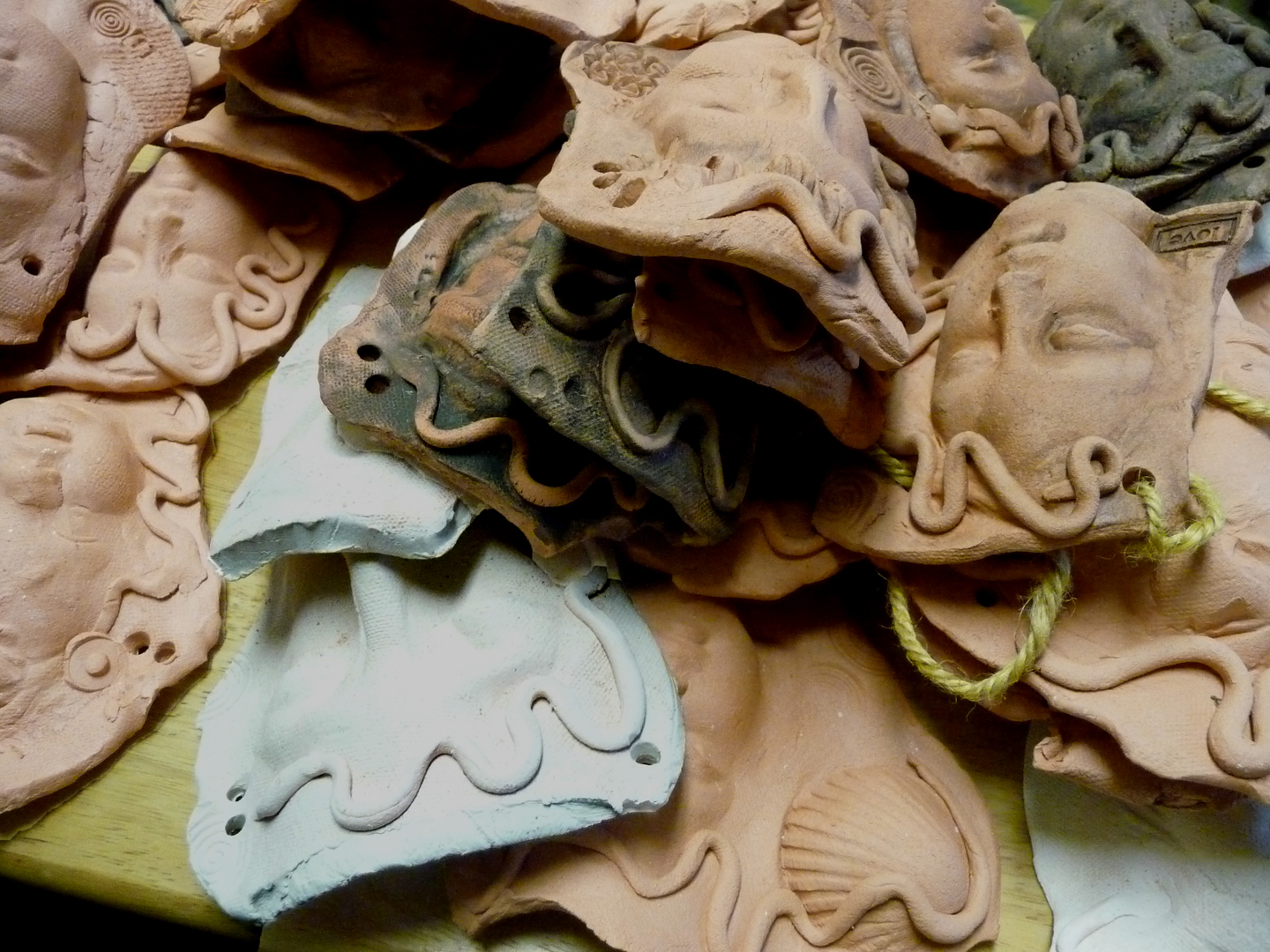 There’s nothing like unloading the kiln to start a flood of new inspirations. As I was stacking pieces, a small face and a little tile said, “Choose us!” It was almost that clear – and always right on. There was a small canvas nearby that I had been experimenting with, so I arranged the pieces on it and voila! A mini-Klimt, a new idea for a series of small framed wall pieces. It will need extending and expanding with consistent color and texture, but not much These would be perfect for my show at LaVida Gallery in June. Dang, art is fun when you listen to it.
