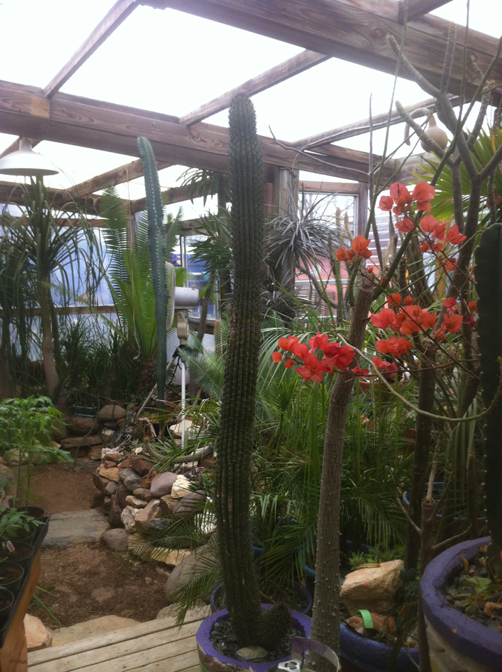 Last week a group of us met at an artist friend’s house to discuss an upcoming herb garden tour. Marty, the homeowner, is a multifaceted furniture designer (check out the arrow table/bench), painter, and cactus sculptor. His garden is a fascinating mini-botanical arboretum with cactus and succulents and raised beds and structures. If you look at the last photo, you can see that he cuts stars on some of his cactus plants and they continue to grow like that as they reproduce. Wow. Marty has a new gallery in Wimberley, Texas – I haven’t seen it yet but I imagine it’s as interesting as his house.