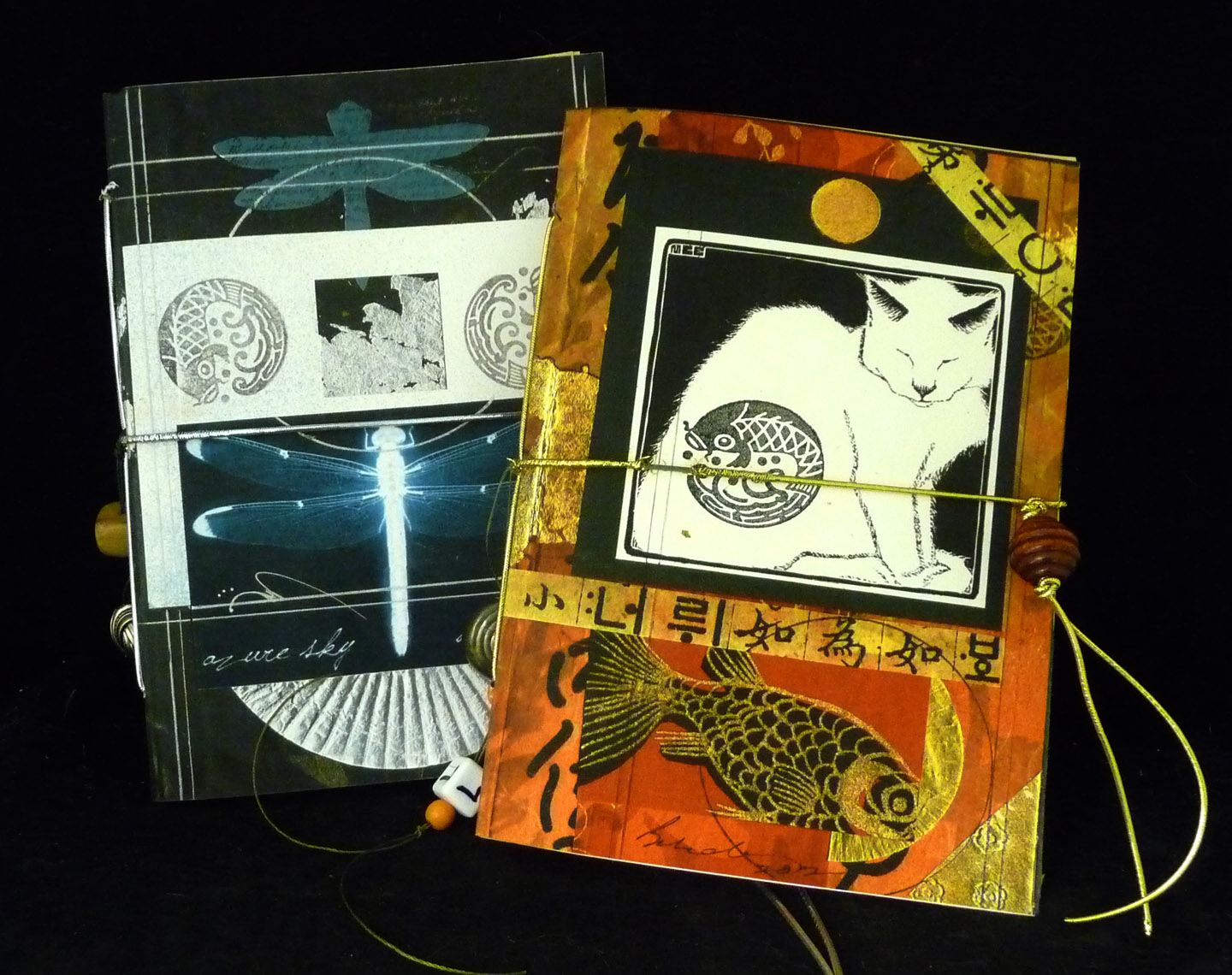 Funny name, but these little journals are the result of several friends’ advice urging me to reproduce my original journal and kindle designs. These “Re-Coverie” journals (appropriate name in many ways) are traditional chapbook construction which feature a color scan of the original designs. The smaller version, little journals that are 5×7″, are sewn with elastic metallic cord so that the “tail” of the book can be pulled over as a closure. My friend Gina gave me good advice on trimming the pages. I’m happy with the results, plus it’s a good way for me to keep track of my original designs from now on.