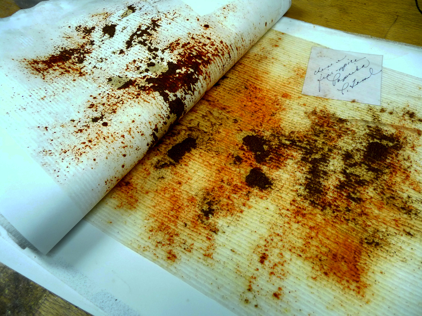 I was experimenting with paper towels when I saw some great stain patterns that were left after cleanup yesterday. A blog post on Cloth Paper Scissors prompted me to try some kitchen ingredients for mixed media surface enhancement, so I got some curry powder and some Chinese Five-Spice Powder and sprinkled them on very damp paper towels (white with fiber). It looked good – after it dried a bit, I brushed off the small clumps and painted some gloss acrylic medium over the surface.