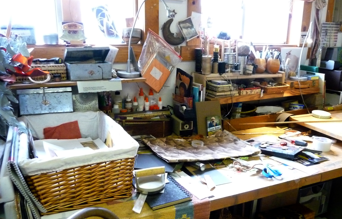 Behind in my work as usual, I had to do a quick change from a collage and drawing studio to a clay studio in about half an hour today. Actually, I’ve organized my tools so that it’s fairly easy. I keep all of my clay tools, clay press molds and carving tools, and rolling boards stacked in one area behind a kitchen butcher block shelf. And I have baskets for the collage material – here are some pictures which show the transformation. Pretty slick re-purposing in a small space!