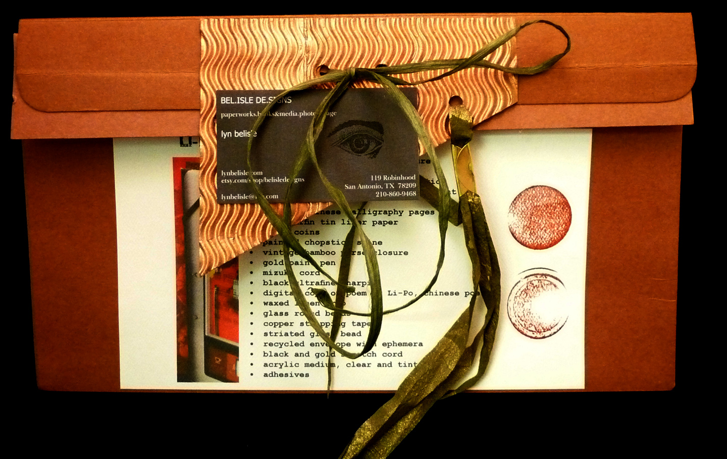 I agonized over how to present my work to the Cloth Paper Scissors editors before I packed it to mail it off. I ended up “re-imagining” some of those brown kraft expanding office folders. I put a strip of mat board in the bottom of the two smaller ones to hold them open, then scored and trimmed the flaps to make fold-overs with punched holes and ties. The larger one was done the same basic way, but the iPad cover was too large for flaps, so I skewered it with some bamboo toothpicks.