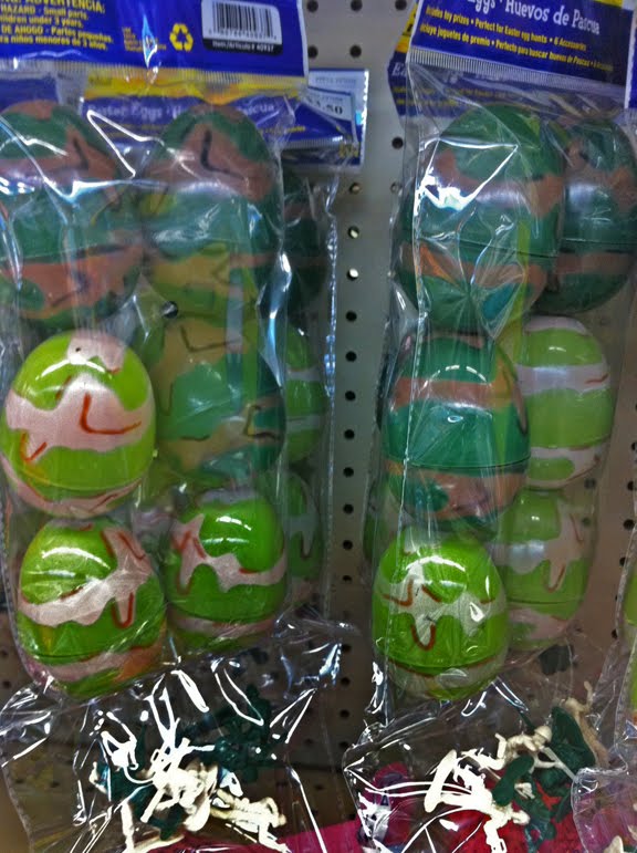 They’re rabbit-design camouflage plastic Easter eggs with an attached package of little toy soldiers shooting at other plastic soldiers that you apparently stuff in the eggs as prizes. What??? That’s nuts!