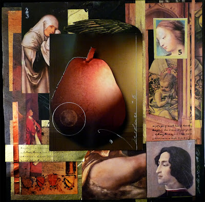 Today I took a new collage to the San Antonio Visual Artists ongoing venue at the Foundry Coffee House. Members can enter one piece at this popular cafe for a $5 hanging fee. I’ll go on Thursday to the opening, but I’ve never seen such an assortment of art – every size and medium. The SAVA website reflects this diversity. It’s as much a non-elitist all-inclusive super-eclectic arts group as I’ve seen in the area. I’m looking forward to seeing how it works and participating a bit more in the future. Today was a small start. Here’s the piece I took – it’s called Pearadigm – I almost didn’t have the nerve to use such a corny name, but I did anyway :).