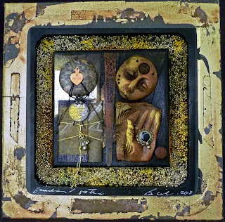 Here are three new small constructions that I have just completed. I really like them. As with anything new, they seem a little undefined/refined, but the idea of a mythical guardian who helps us choose our lifepath has always resonated with me as it has in many other cultures. Here are the first three pieces. They are made of fired clay, paper, wood and gold leaf on stretched canvas. Each piece measures 12×12 inches, the titles are beneath the photographs.