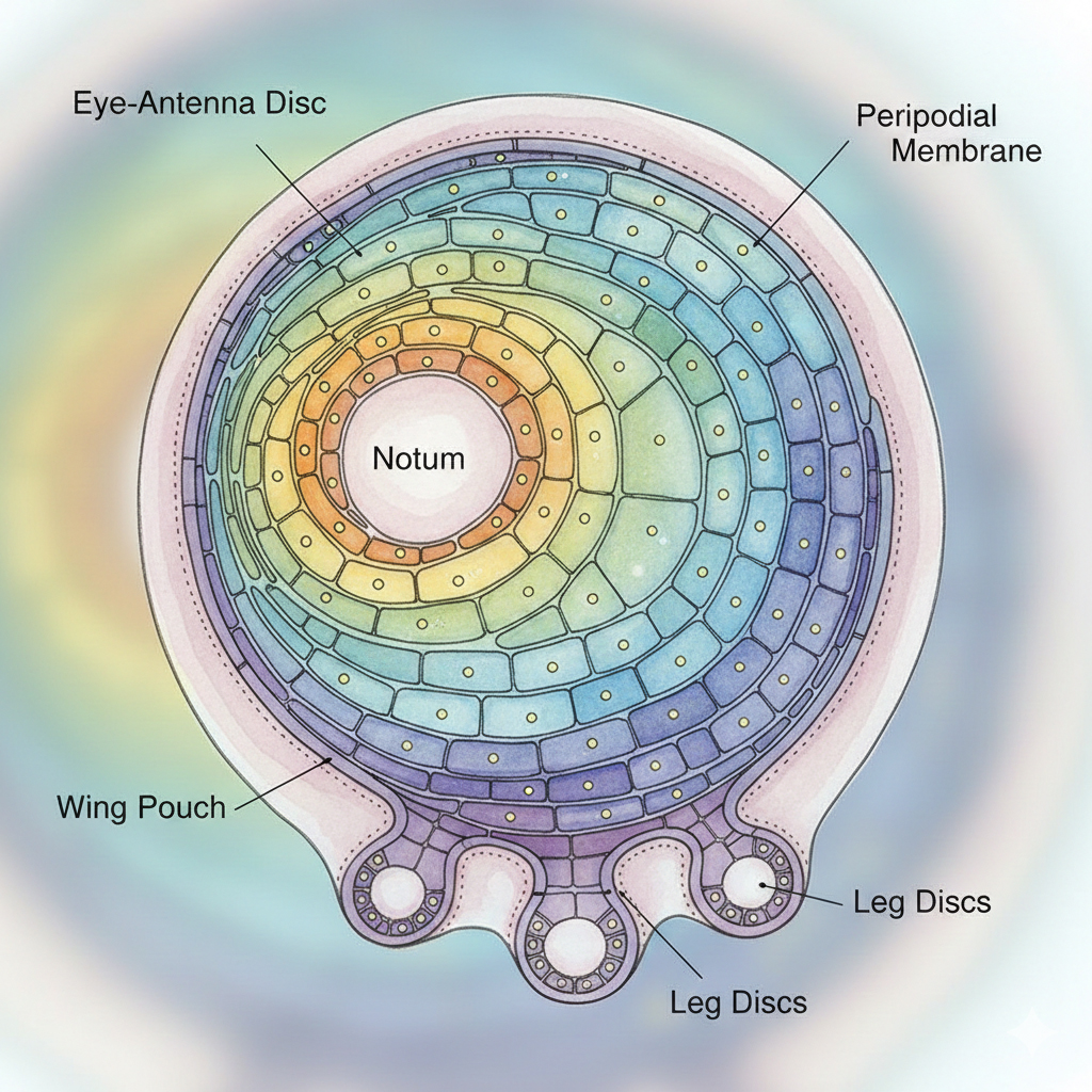 An imaginal disc is that strange, silent thing inside a caterpillar that already knows it will become a wing (see the wing pouch i the diagram below). It doesn’t look like a wing. It isn’t useful yet. And at first, the caterpillar’s immune system even tries to destroy it. But eventually, that tiny cluster of cells becomes the organizing force of the entire transformation.