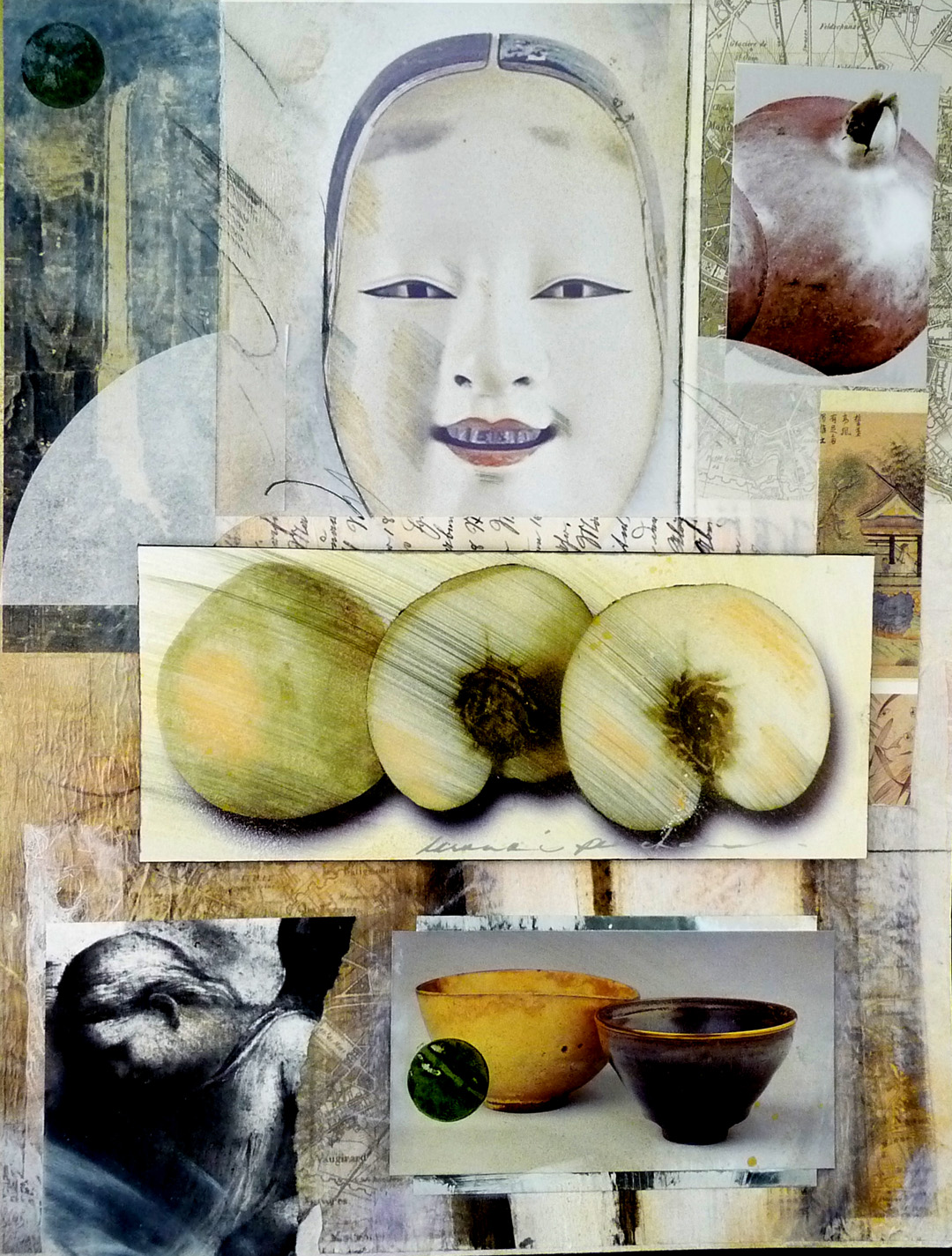 It’s always a little risky to step out from what’s already working, but I just finished two new collages with an Asian influence and a different, softer palette than the previous Renaissance-themed work. I liked the idea of using Noh masks as a central motif – I’m still using my altered fruit photos, and they still seems to work. So far, so good – would like some fresh new work for the April show at La Vida. This feels like a good direction right now, or maybe it’s because I’m just ready for spring after all this unusually cold weather!