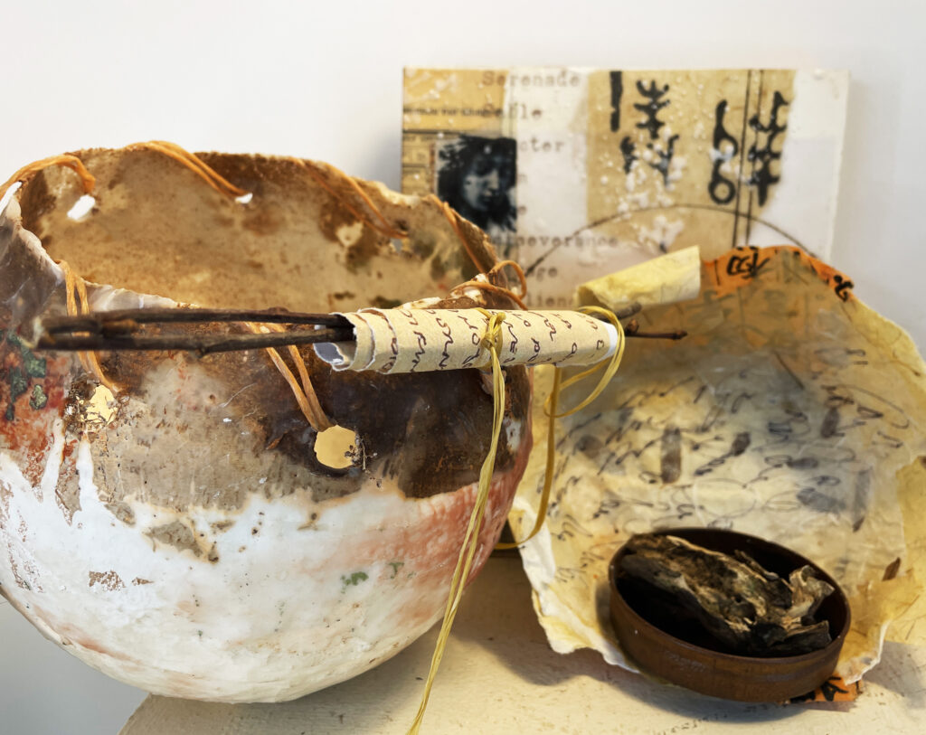 “Vessel Alchemy: Tactile Poems in Fiber, Paper, Word, and Light” — In this immersive workshop, we’ll explore how simple materials—sticks, cheesecloth, mulberry paper, fiber scraps, ink — can be transformed into poetic vessels that speak to memory, meaning, and the ephemeral.”